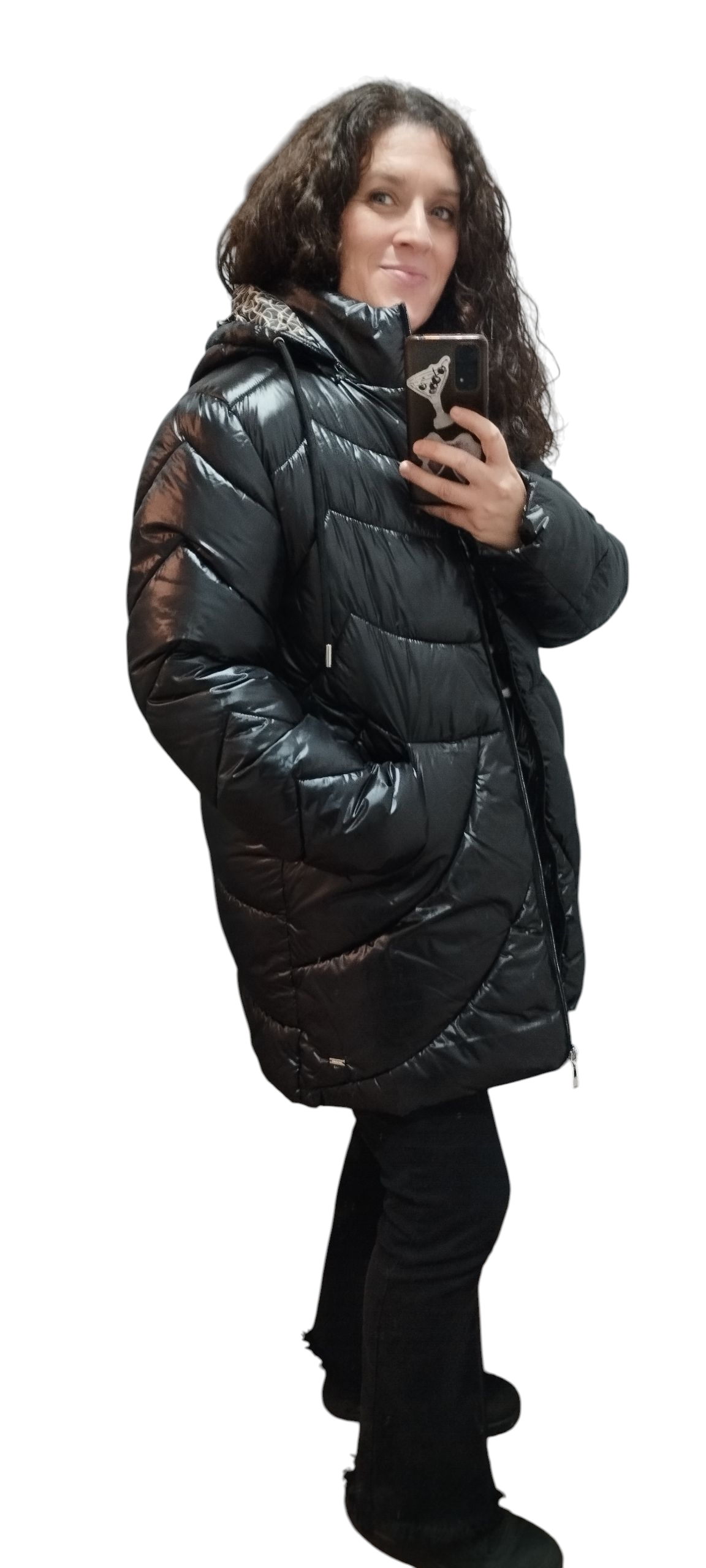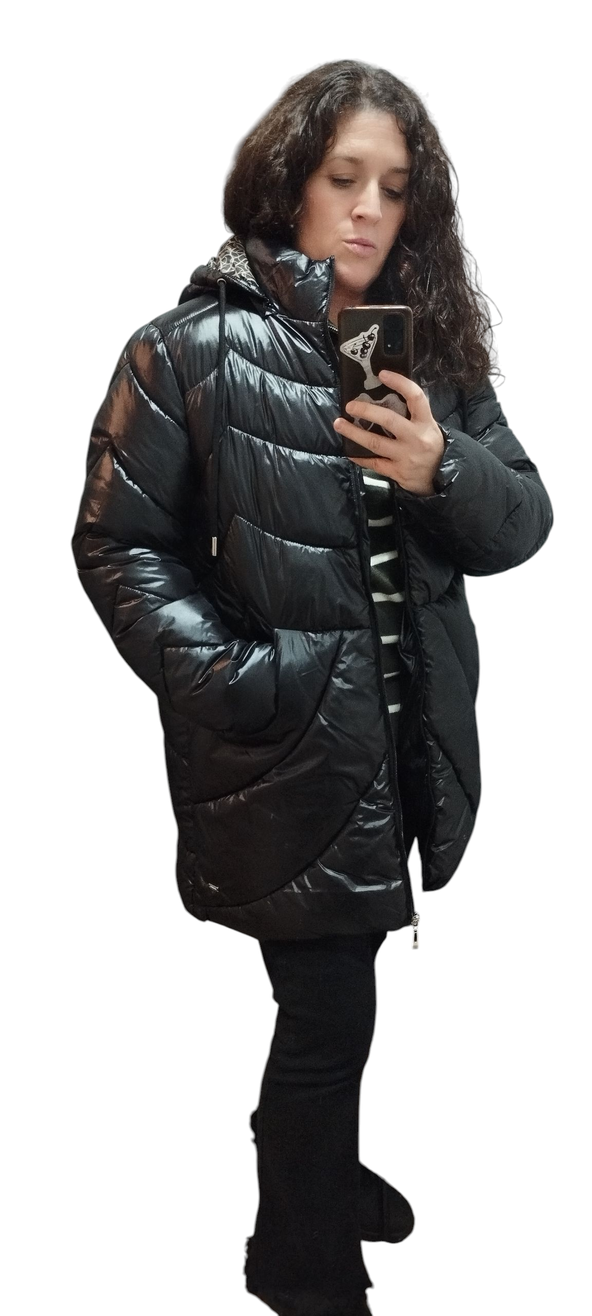 Abrigo acolchado en negro brillante, súper juvenil y versátil.