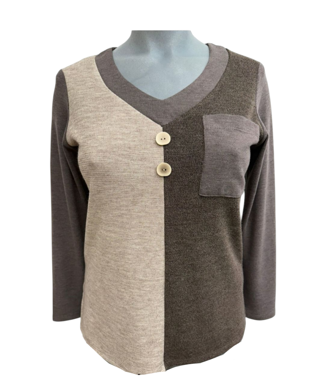 Esta preciosa camiseta de escote de pico en dos colores marrón y tostado es única gracias a sus botones simil madera en el delantero. Te mantiene caliente con su tejido de punto gordito de muy buena calidad. ¡Hecha en España para asegurar un producto de excelencia!