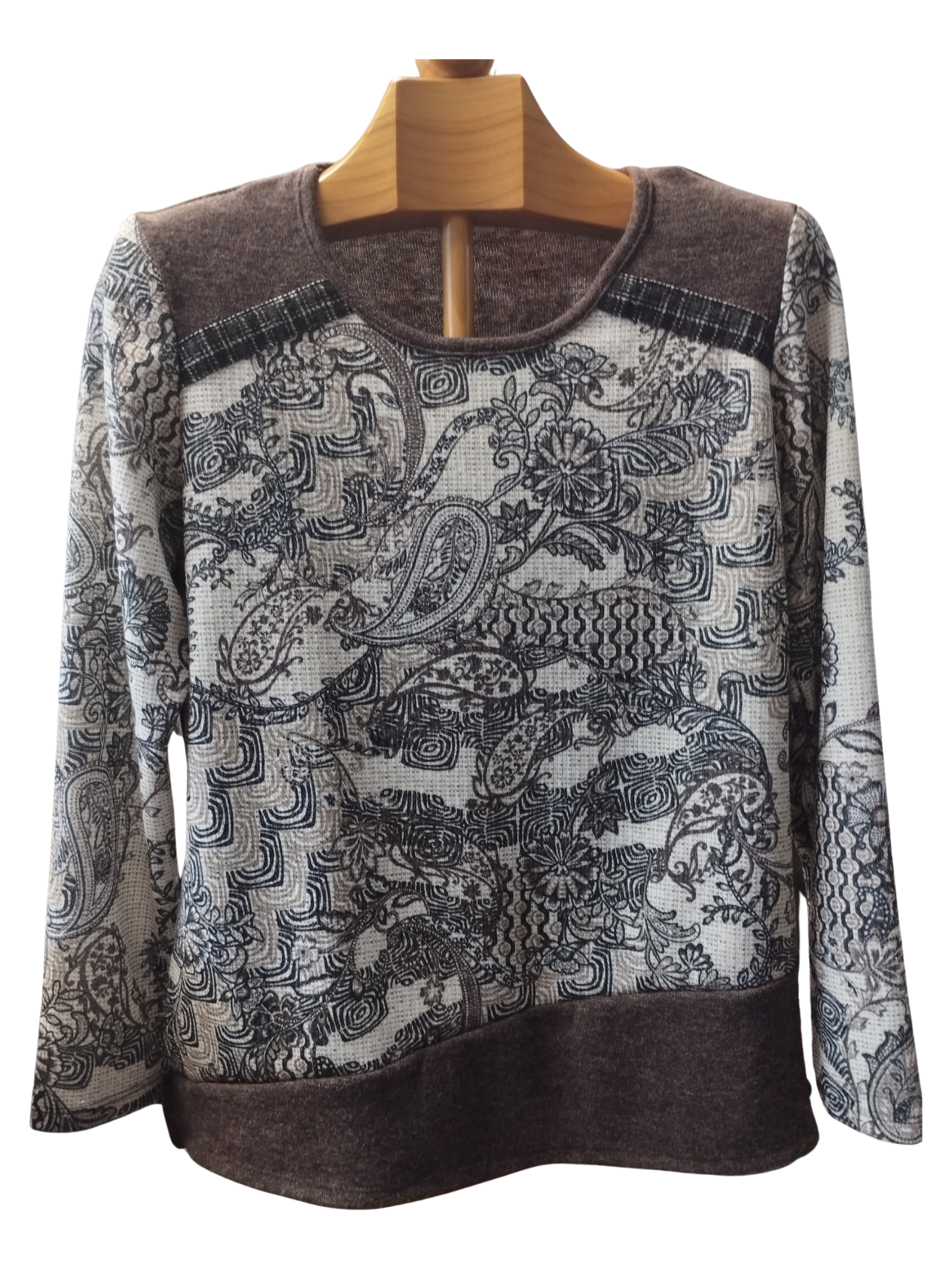 Preciosa camiseta de cuello semi redondo en tejido gordito y calentito con ligero brillo en el estampado en un tono amarronado ideal que combine con todo elegante cómoda y a la moda.