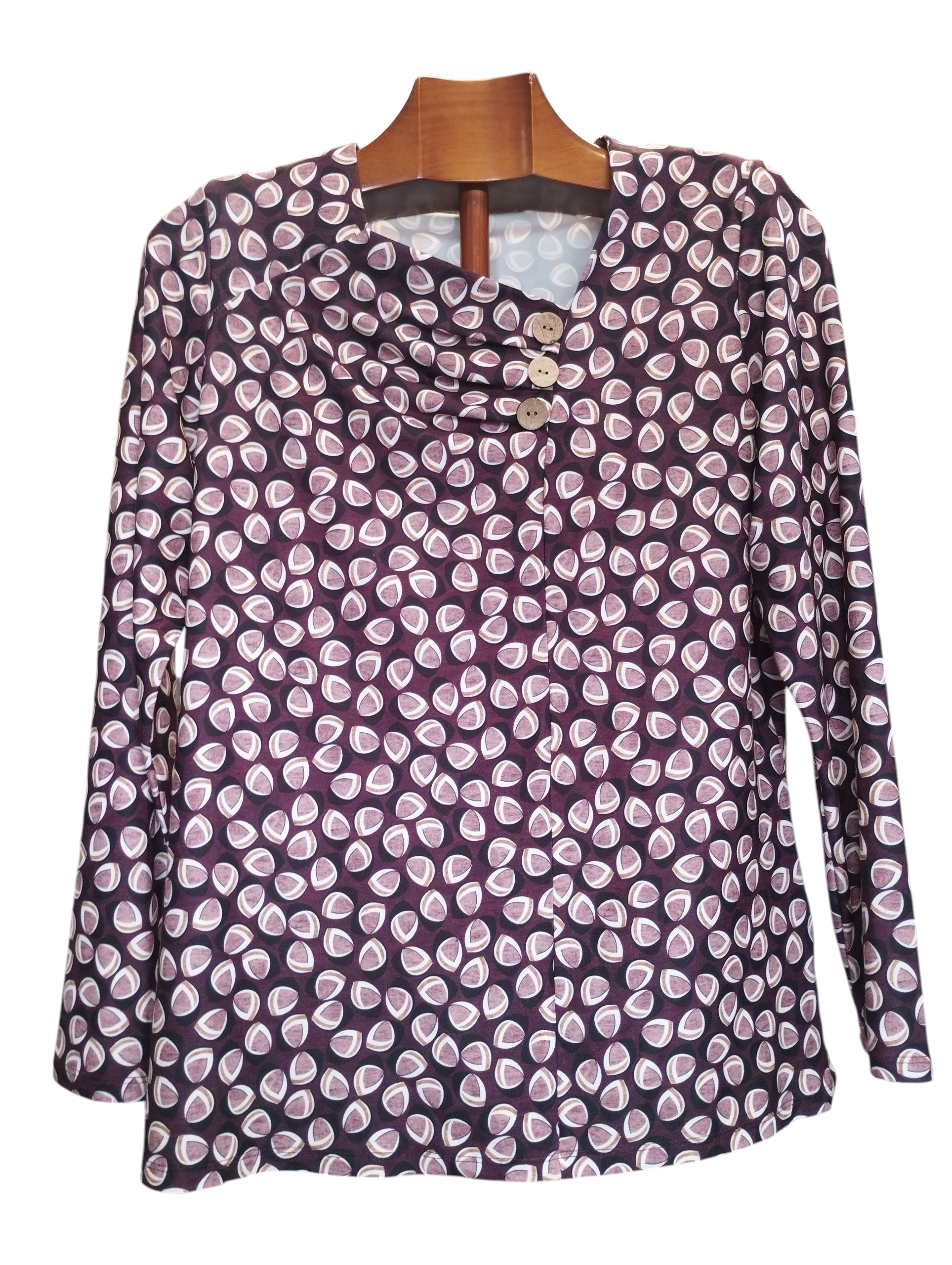 Preciosa camiseta de manga larga en tejido de punto amelocotonado con un estampado ideal en tonos burdeos y negros. Destaca por su escote en forma de trapecio y sus elegantes botones simil madera y plieguitos que la hacen única. Hecha en España con calidad.