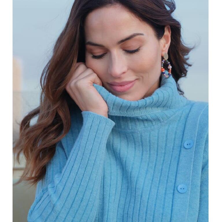 Este jersey cisne azul te hace sentir elegantemente cálida. Con un suave cuello cisne, color celeste y detalles únicos, no querrás quitártelo. Además, su botonera frontal añade un toque de sofisticación. ¡Un imprescindible de alta calidad en tu armario!
