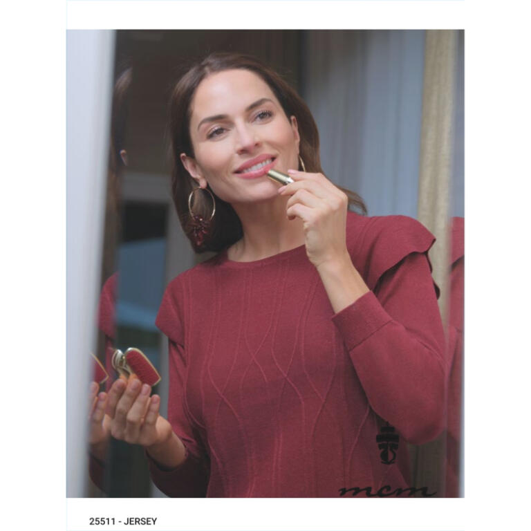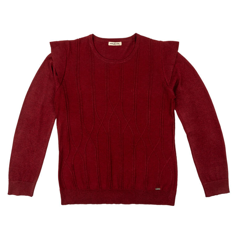 Este precioso jersey de tono granate con un ligero brillo es perfecto para entretiempo. Sus volantes en el hombro le dan un toque único y elegante. Además, su calidad es inigualable y su suave tacto lo hace irresistible. ¡No te lo pierdas!